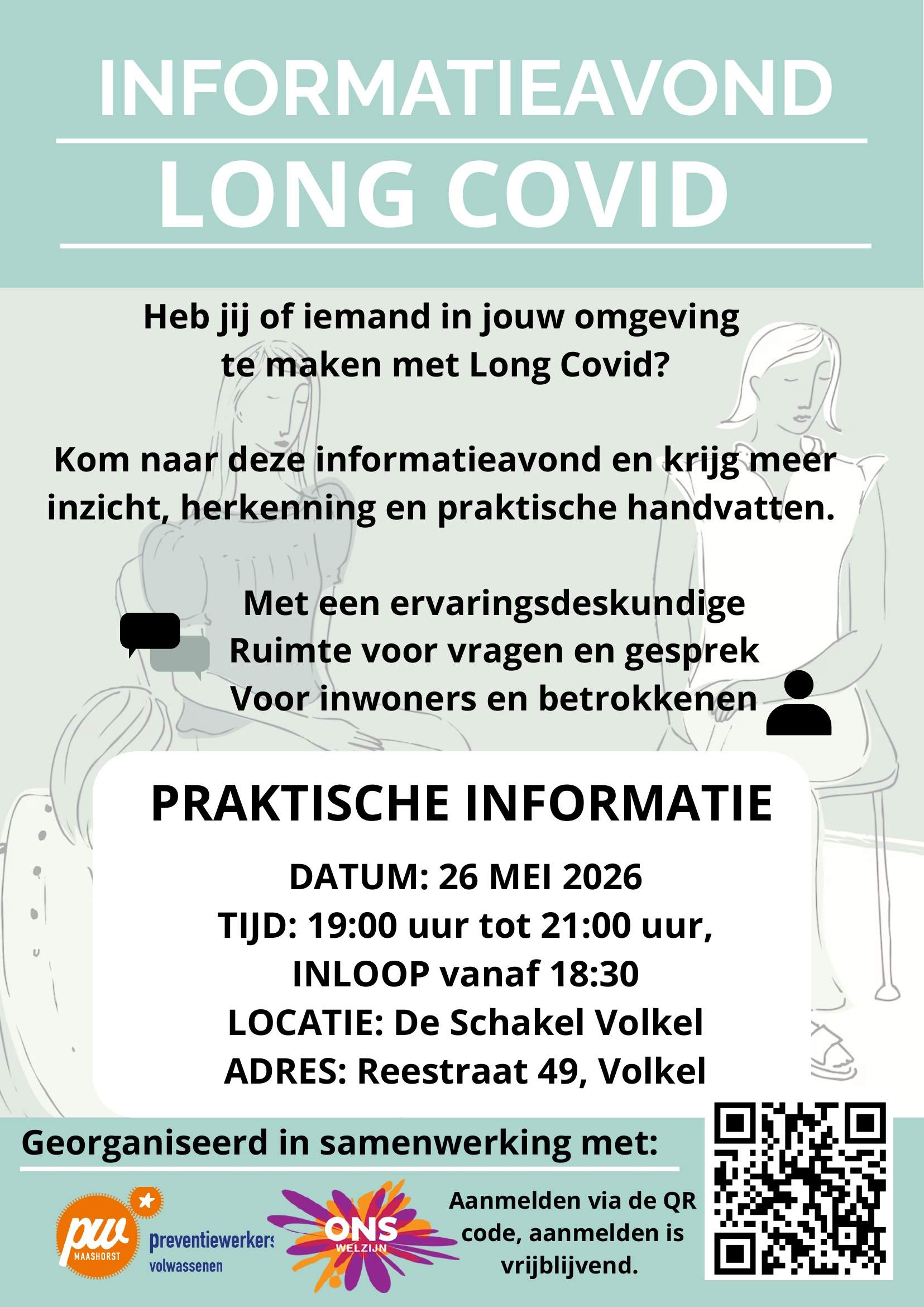 De bijeenkomst is bedoeld voor zowel inwoners als betrokkenen. Er is onder meer een ervaringsdeskundige aanwezig en er is ruimte voor vragen en gesprek. De avond duurt van 19.00 tot 21.00 uur, met inloop vanaf 18.30 uur, aan de Reestraat 49 in Volkel. Aanmelden kan vrijblijvend via de QR-code op de poster.